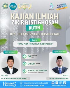 Pekanbaru, Senin 6 Oktober 2025 – Universitas Islam Negeri Sultan Syarif Kasim (UIN Suska) Riau kembali menggelar Kajian Ilmiah Rutin Bulanan yang dirangkaikan dengan Istighosah bersama civitas akademika, dengan tema “Ilmu Alat Penuntun ke Jalan Kebenaran”. Kegiatan ini berlangsung di Masjid UIN Suska Riau, yang diisi oleh Dr. Saidul Amin, MA, dosen Aqidah dan Filsafat Islam, Fakultas Ushuluddin UIN Suska Riau.