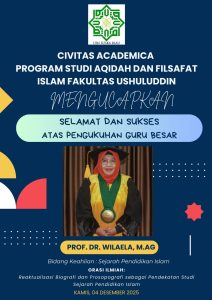 (Pekanbaru, 04 Desember 2025) Program Studi Aqidah dan Filsafat Islam, Fakultas Ushuluddin, UIN Suska Riau kembali berbangga dengan bertambahnya Guru Besar (Profesor) melalui Sidang Senat Terbuka Pengukuhan Guru Besar yang dilaksanakan pada Kamis, 04 Desember 2025 di Pusat Kegiatan Mahasiswa (PKM). Sebanyak tujuh orang dosen yang mendapatkan gelar Guru Besar, salah satu diantaranya adalah Prof. Dr. Wilaela, M.Ag di bidang Sejarah Pendidikan Islam. Acara dihadiri langsung oleh Pimpinan Universitas, Para Guru Besar, Sivitas Akademika, tamu undangan, serta keluarga besar Prof. Wilaela.
